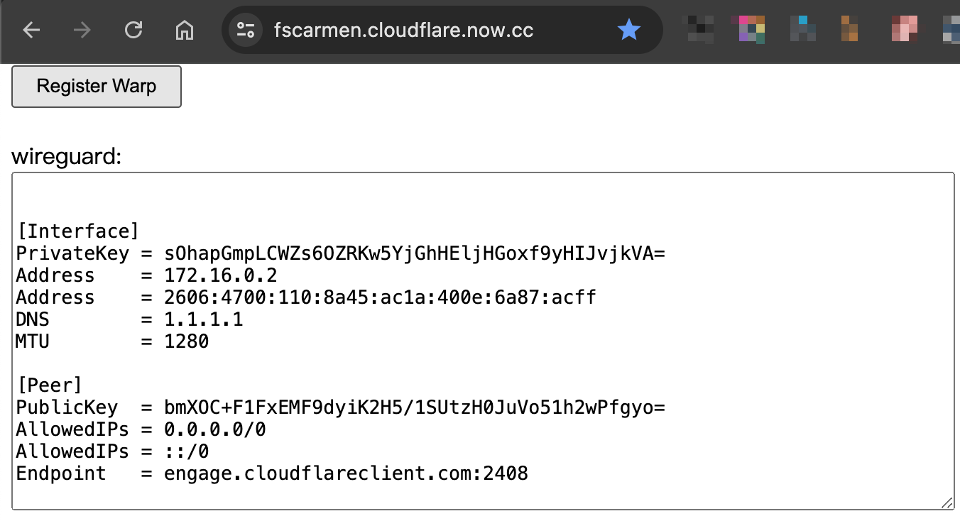 Visit https://warp.cloudflare.now.cc/?run=register&format=yaml and record private_key, v6 2 values